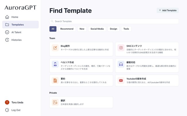 チーム用にテンプレートを作成し、チームでの業務の効率化、標準化が出来ます。また、プライベート用でもテンプレートを作成し、自分だけの業務改善に取り組むことも出来ます。サンプルのテンプレートはAuroraGPTのテンプレート特設サイトから取得することも可能です。