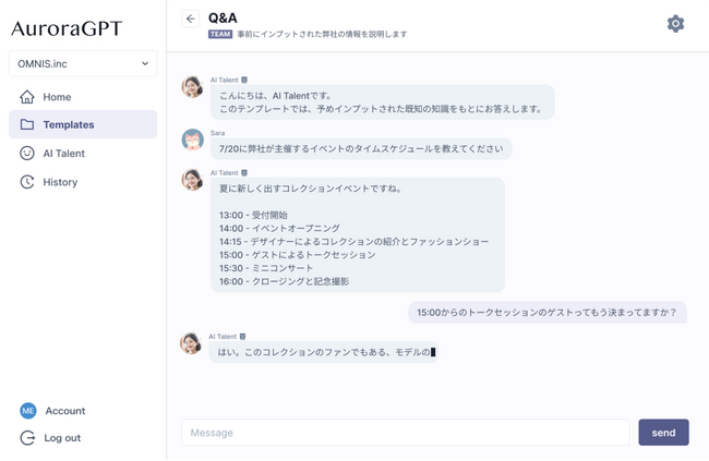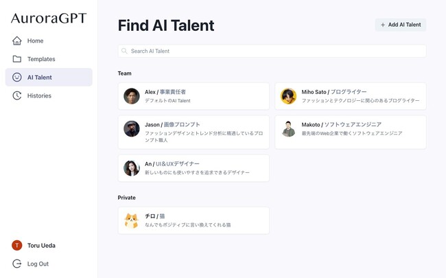 「AIタレント」はAIの専門家を簡単に作成出来る機能です。チーム用にAIタレントを作成し、チームで不足している専門家を加えることが出来ます。プライベート用では自分と同じ職種の専門家を作成し、様々なサポートを受けることが出来ます。サンプルのAIタレントはAuroraGPTのテンプレート特設サイトから取得することも可能です。