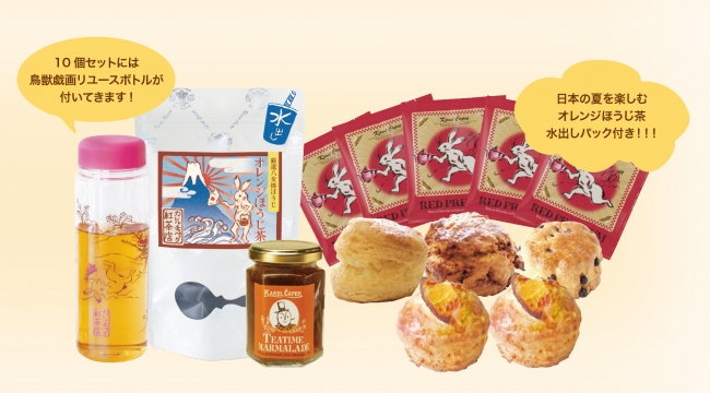 8月は4種類のスコーンに加え、厳選した八女の棒ほうじ茶で作った水出しオレンジほうじ茶、稀少な茶葉を使用した最高品質の紅茶・レッドプレミアムのティーバッグ、深いコクが自慢のティータイムマーマレードも付いた豪華セット!(スコーン10個入り:4,536円、5個入り:3,456円)