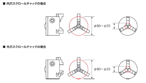 付属の回転加工機は内爪、外爪ともφ25〜80の加工素材に対応します。