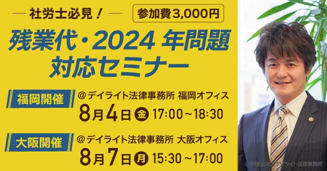 労働問題の豊富な経験を有する弁護士が「社労士必見!残業代・2024年問題対応セミナー」を8月4日(金)に福岡、8月7日(月)に大阪でリアル開催します。