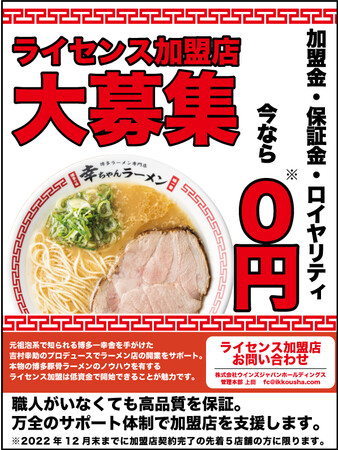 株式会社ウインズジャパンホールディングス(所在地:福岡県福岡市博多区、代表取締役社長:吉村 幸助)は、博多ラーメン専門店のプロデュース事業部門において2022年11月1日 9:00に博多ラーメン専門店『幸ちゃんラーメン』福岡空港店を福岡空港国内ターミナル3階「ラーメン滑走路」内にオープンいたします。博多一幸舎の創業者である吉村幸助がプロデュースする『幸ちゃんラーメン』の4店舗となる福岡空港店は、国内で屈指の旅客数を誇る福岡空港の国内ターミナル3階に2017年に開業したラーメンの複合エリア「ラーメン滑走路」内に2023年秋までの約1年間の期間限定出店をいたします。旅行やビジネスで空港をご利用になる方、地元、福岡にお住まいの方や空港内で勤務される方など、すべてのお客様に「美味しかった」「旨かった」と喜んでいただける商品とサービスを提供してまいります。