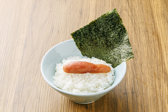 白ごはんに小ぶりな明太子が丸っと1本と海苔。相性抜群のご飯もの。