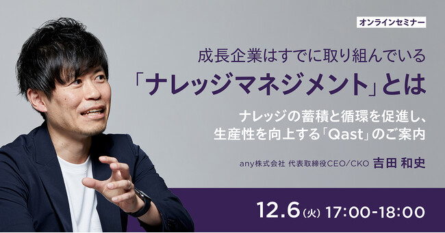 ナレッジ経営クラウド「Qast」を運営するany株式会社は2022年12月6日、オンラインセミナー【成長企業はすでに取り組んでいる「ナレッジマネジメント」とは】を開催致します。労働人口の減少が叫ばれる昨今、生産性の向上は企業の成長と発展における重要なカギとなっています。企業の生産性の向上を阻む2つの壁とは何か、どうすればその壁を乗り越えることができるのかを考えます。