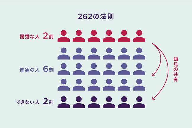 「262の法則」とは、「どのような組織も、人材の構成比率は、優秀な働きを見せる人が2割、普通の働きをする人が6割、貢献度の低い人が2割となる」という理論を指します。一定人数を超える組織では、当たり前となっているこの法則を覆すことができるのは、「2割のハイパフォーマーによる知見共有」にあると考えます。「262の法則」が当てはまってしまう大きな原因の一つは、2割のハイパフォーマーはなぜハイパフォーマーなのか、がブラックボックス化しているためです。2割のハイパフォーマーのノウハウなどを共有し、属人化を排除することが成果を安定させ、持続可能性の高い組織を実現することにつながります。
