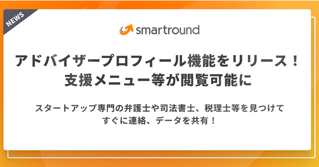 「スタートアップが可能性を最大限に発揮できる世界をつくる」をミッションに掲げる株式会社スマートラウンド(本社:東京渋谷区、代表取締役:砂川大、以下「スマートラウンド」)は、スタートアップと投資家のためのデータ作成・管理プラットフォーム「smartround」の新機能としてアドバイザープロフィール機能をリリースしたことをお知らせいたします。