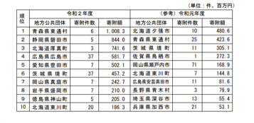 「企業版ふるさと納税令和2年度寄附実績について(令和3年8月27日)」参考)寄附受入額が多い地方公共団体