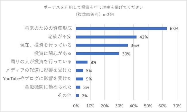 また、「ボーナスを利用して投資を行う理由を挙げてください」との質問では1位が「将来のための資産形成」(63パーセント)、2位が「老後が不安」(42パーセント)となりました。その他では「現在、投資を行っている」(36パーセント)、「投資に関心がある」(30パーセント)が多くの回答を集めました。上位2つの回答を見ると「将来への備え」が投資の大きな動機付けになっているようです。
