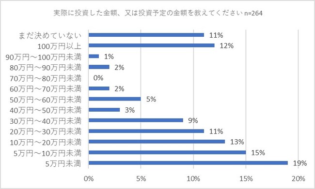 最後に、実際に投資した金額、又は投資予定の金額を質問しました。「5万円未満」が19パーセントで最多。「5万円〜10万円未満」が15パーセントで2位となりました。それ以降では「10万円〜20万円未満」(13パーセント)、「100万円以上」(12パーセント)、「20万円〜30万円未満」と「まだ決めていない」(ともに11パーセント)が続きました。10万円ごとの数字で見てみると「10万円未満」が34パーセントで突出した数字となりました。