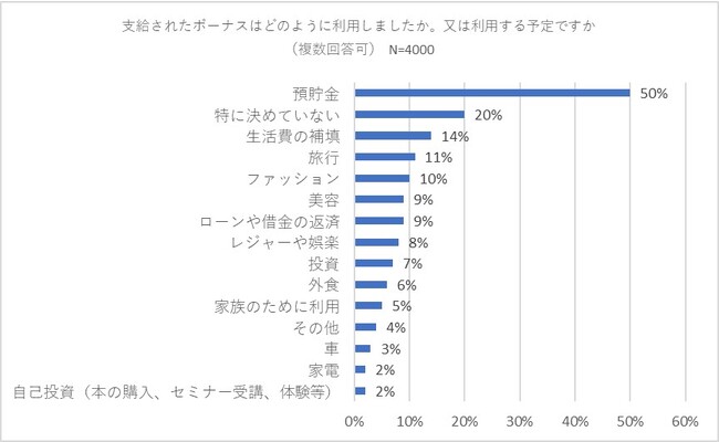 次に、「支給されたボーナスはどのように利用しましたか。又は利用する予定ですか」と尋ねたところ「預貯金」が50パーセントで2位以下を大きく引き離してトップになりました。2位は「特に決めていない」(20パーセント)、3位は「生活費の補填」(14パーセント)でした。以下、「旅行」(11パーセント)、「ファッション」(10パーセント)、「美容」と「ローンや借金の返済」(ともに9パーセント)が続きました。また、「投資」と回答したのは7パーセントでした。