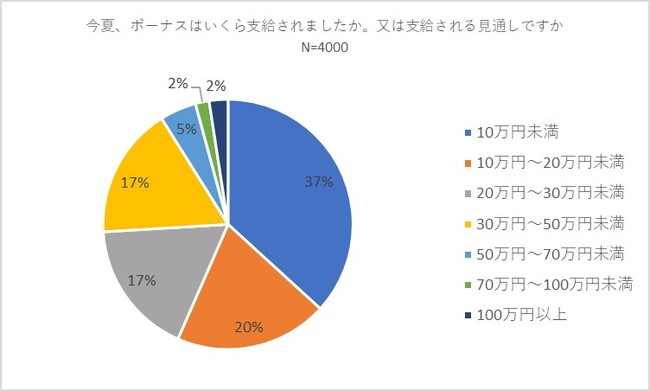 最初に回答者全員に対して「今夏、ボーナスはいくら支給されましたか。又は支給される見通しですか」との質問を行いました。その結果、「10万円未満」が37パーセントで最多の回答を集めました。続いて「10万円〜20万円未満」が20パーセントで入り、6割弱が20万円未満の支給であることがわかりました。さらに「20万円〜30万円未満」と「30万円〜50万円未満」がともに17パーセントで後に続きました。