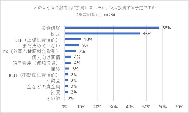 続いて前設問でボーナスの使い道として「投資」を選択した264人に対し質問しました。「どのような金融商品に投資しましたか。又は投資する予定ですか」と尋ねたところ、主な投資先は「投資信託」と「株式」であることがわかりました。1位は「投資信託」で58パーセント、2は「株式」で46パーセントでした。それ以下では「ETF(上場投資信託)」(10パーセント)、「まだ決めていない」(9パーセント)、「FX(外国為替証拠金取引)」(7パーセント)との回答が続きました。