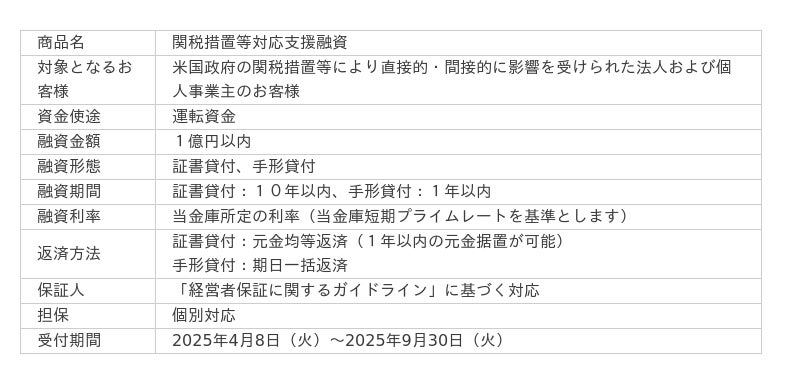 米国政府の関税措置などにより影響を受けられる事業者様の支援のため「相談窓口」を設置し「専用融資制度」の取扱を開始します