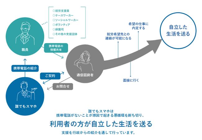 日本では、携帯電話を持つことができないために、仕事や住居を確保できない「通信困窮者」が約500万人いると言われています。『誰でもスマホ』は、このような通信困窮問題の解消に向け、各支援施設と連携を深めています。