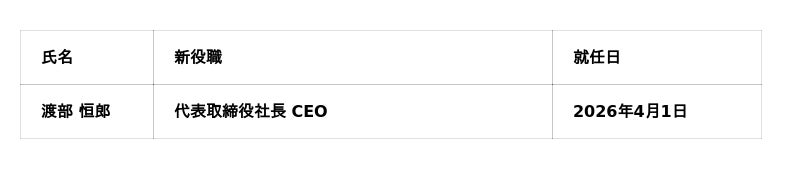 企業価値を最大化する「バリューアップコンサルティング」と「業界特化型M&A」を提供する株式会社スピカコンサルティング(本社:東京都港区、代表取締役社長 CEO:渡部 恒郎、以下「当社」)は、2026年4月1日(水)付で、新たに代表取締役社長 CEOに渡部 恒郎(わたなべ・つねお)が就任したことをお知らせいたします。新たな経営体制のもと、事業全体を国内トップの品質へと向上させることを目指し、中堅・中小企業の成長支援を通じて日本経済の発展に貢献してまいります。なお、これまで代表取締役を務めた中原 駿男(なかはら・としお)は役職を代表取締役 COOに改め、引き続き当社にて事業戦略の立案・実行に従事いたします。