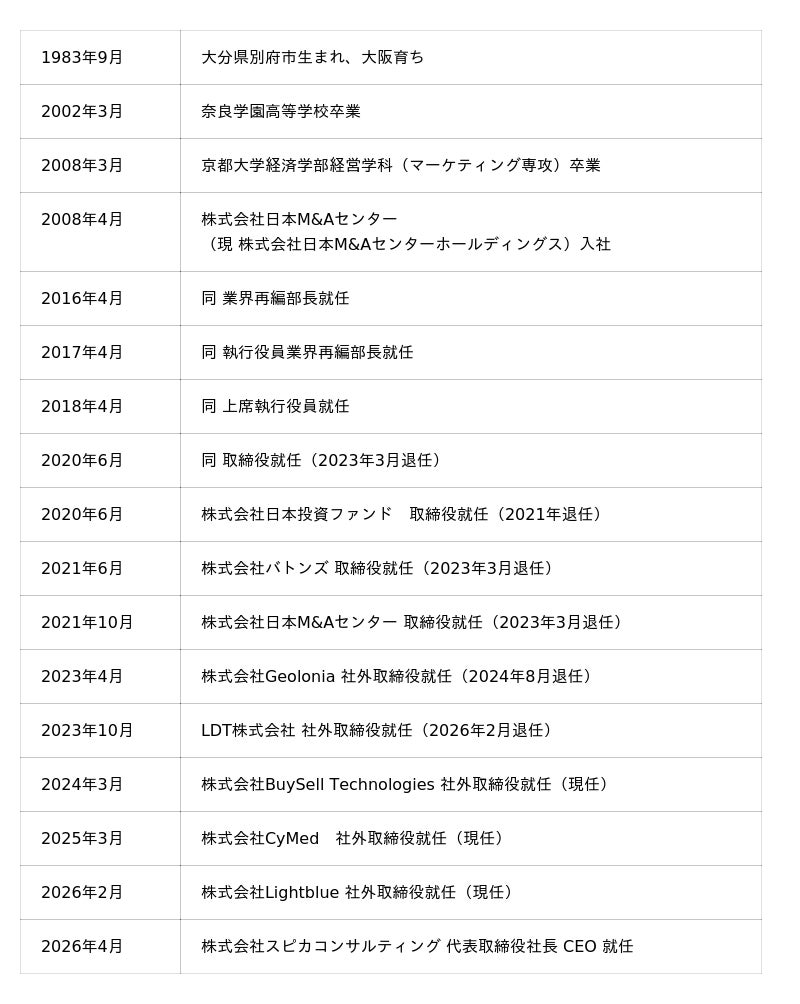 京都大学在学中に起業を経験の上、日本M&Aセンターへ入社。中堅・中小企業M&AのNo.1コンサルタントとして日経ヴェリタスに取り上げられるなどM&A業界を牽引してきた。業界再編M&Aの第一人者。2020年同社最年少で取締役に就任。2023年3月31日に日本M&Aセンターホールディングスの取締役を辞任。その後、3年間にわたり複数の上場企業や成長企業の社外取締役ならびに顧問を歴任し、企業価値/株価の向上に貢献。2026年4月1日よりスピカコンサルティングの代表取締役社長 CEOに就任。