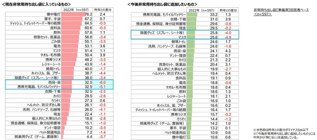 ■非常用持ち出し袋に今後追加したいものとして「除菌グッズ」「マスク」が減少傾向