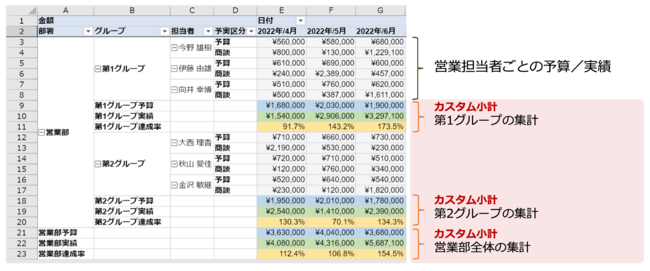 今回のアップデートでは、RaySheetPivotに「カスタム小計」という機能を追加しました。カスタム小計は、クロス集計の集計結果に対して独自の計算式を設定し、一覧上の任意の行や列に挿入できる機能です。商談と受注といった異なるオブジェクトも集計対象にできるため、CSVに出力してからExcelで加工するといった手間をなくし、自由な切り口の分析をリアルタイムで行えるようになります。例えば、予算から販売管理費の小計を算出したり、受注データから営業利益をリアルタイムで確認する、あるいは取引先ごと、事業部ごとの予算と実績の差異や達成率をひと目で把握するといったことが可能になります。