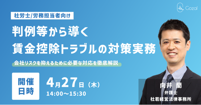 クラウド型給与計算チェックソフト「Gozal(ゴザル)」を運営する株式会社Gozal(本社:東京都目黒区、代表取締役:高谷 元悠)は、「判例等から導く賃金控除トラブルの対策実務」について2023年4月27日(木)14時〜社若経営法律事務所(東京都千代田区、代表弁護士:向井 蘭)とオンラインウェビナーを共催いたします。