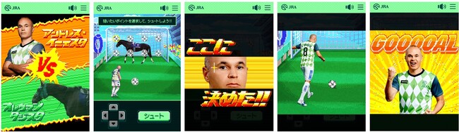 イニエスタ選手を操作して “ゴールキーパー”からゴールを決めるコンテンツ「イニエスタのファンタジスタPK」では、「サッカーにちなんだ馬名がついた実在のレジェンド競走馬」がゴールキーパーとなって登場。 鉄壁の守りを誇る競走馬との熱戦を制し、完全勝利を目指します。