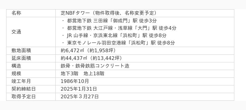 トヨタ不動産株式会社(東京本社:千代田区有楽町、取締役社長:山村 知秀)は、2025年1月31日、「芝NBFタワー」(所在地:港区芝大門1-1-30、以下「本物件」)の信託受益権を取得する契約を締結いたしましたので、お知らせいたします。