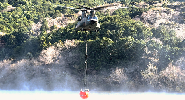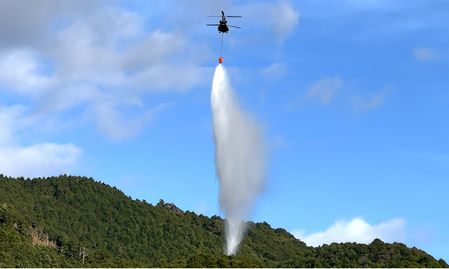 消火対処能力の向上を図るため行われた訓練では、陸上自衛隊の大型ヘリコプター(CH-47JA)にファイテック社製消火剤注入装置FEIと、1度の取水で5,000リットルの水が入る空中消火バケツ(野火消火器材I型 バンビ・バケット)に森林火災用消火剤FOREST DEFENDER(フォレスト・ディフェンダー)をヘリコプターから注入し、これまでになかった素早い空中消火活動を実現するための実践を模擬した訓練が行われました。