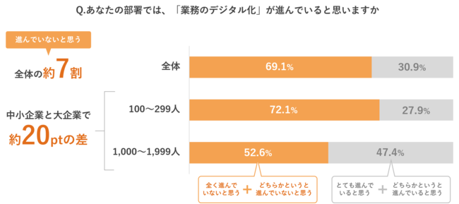 所属する部署において紙書類の電子化やハンコの廃止などの「業務のデジタル化」が進んでいると思うかという質問に対しては、「全く進んでいないと思う」が28.8%、「どちらかというと進んでいないと思う」が40.3%で、計69.1%が「進んでいないと思う」と回答。また、「進んでいないと思う」と回答した割合を従業員数別でみると、100〜299人規模では72.1%を占めているのに対し、1,000〜1,999人規模では52.6%と、企業規模により業務のデジタル化の推進状況に大きく差があることがわかりました。