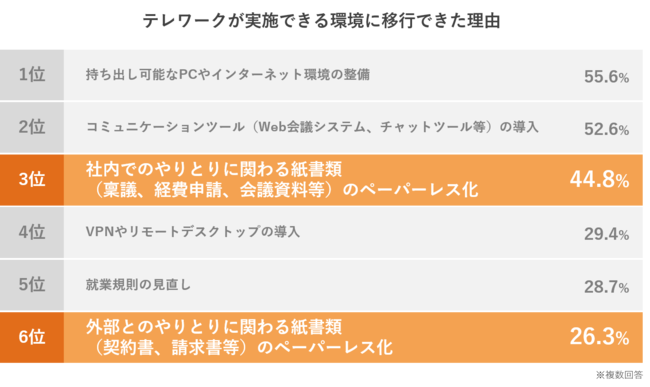 また、テレワークが実施できる環境に移行できた理由として、社内外の紙書類のペーパーレス化が上位に入っています。