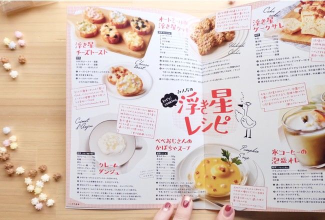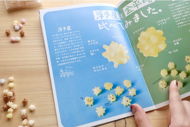 特徴は、なんといっても「浮き星のおまけ付き」であるということ。ただ文字と写真で紹介するだけでなく、読んだ上で、読者に実際の「浮き星」を楽しんでほしいという制作側の強い希望から、ページ内に「浮き星(ミニ袋)」を挟んだ仕様となっています。(味はランダムになります)