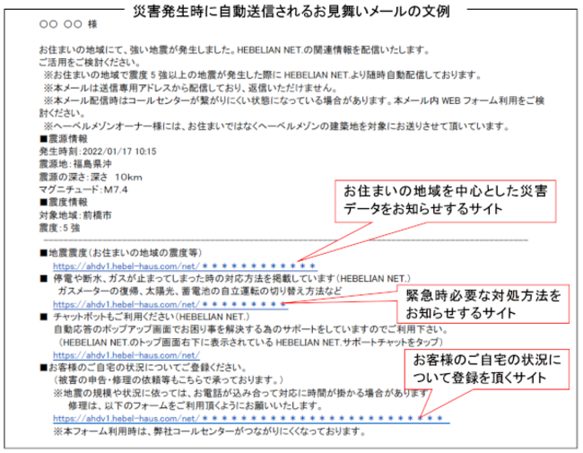 「災害BOT(仮称)」は、風水・地震災害発生時に、発災直後と12時間経過後の2回にわたり、会員制ネットクラブのHEBELIAN NET.登録のお客さまにメールを送付。発災直後はお見舞いメールとともに、ガスメーター復旧法など、災害時に必要な代表的処置について案内。気象庁発表の震度情報も、顧客居住建物所在地を中心に表示してお知らせします。また、建物の状況をお客様自身が入力できるフォームを発災直後と12時間経過後の2回送付。入力情報をもとに、効率的な点検・フォロー体制を構築し、住宅メーカーならではのフォロー体制で、お客様に災害時における「つながる安心」をご提供いたします。