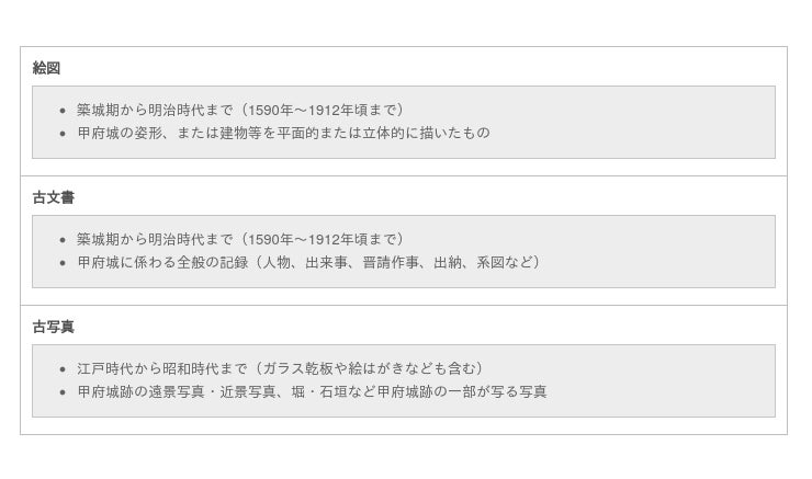 ○内 容:甲府城跡に関連する古文書や絵図、古写真などについて、甲府城と歴史的に関係の深い全国の博物館等へ照会し、調査を行います。