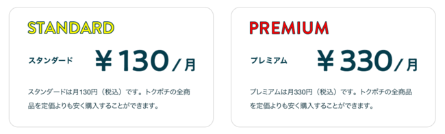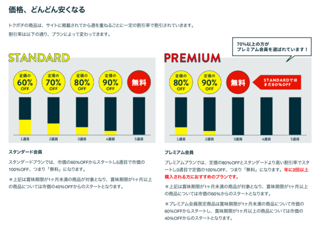 トクポチで商品を購入するには「スタンダード」と「プレミアム」2つのプランのどちらかに加入する必要があります。商品は、サイトに掲載されてから を重ねるごとに一定の割引率で割引されていきます。割引率は以下の通り、プランによって変わってきます。