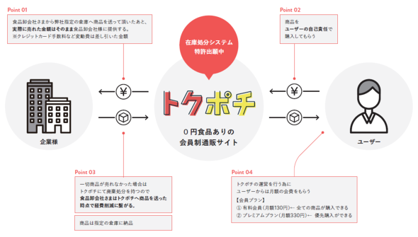 今まで廃棄していた商品や余剰在庫と会員さまをマッチングさせて販売し、 配送までを行うことで、食品事業者さまの人件費を使って現金化する業務をトクポチが人件費無料で代行させていただきます。