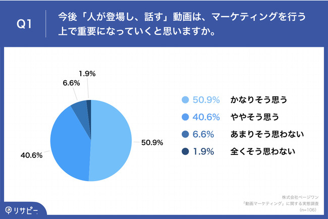 「Q1.今後「人が登場し、話す」動画は、マーケティングを行う上で重要になっていくと思いますか。」(n=106)と質問したところ、「かなりそう思う」が50.9%、「ややそう思う」が40.6%という回答となりました。