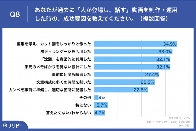 「Q8.あなたが過去に「人が登場し、話す」動画を制作・運用した時の、成功要因を教えてください。(複数回答)」(n=106)と質問したところ、「編集を考え、カット割をしっかりと作った」が34.9%、「ボディランゲージを活用した」が33.0%、「「沈黙」を意図的に利用した」が32.1%という回答となりました。