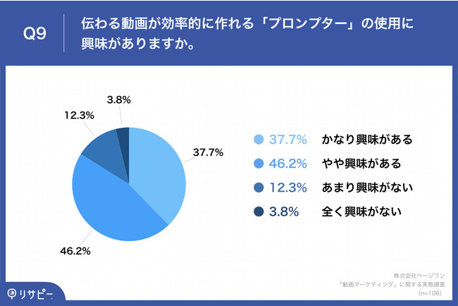 「Q9.伝わる動画が効率的に作れる「プロンプター」の使用に興味がありますか。」(n=106)と質問したところ、「かなり興味がある」が37.7%、「やや興味がある」が46.2%という回答となりました。