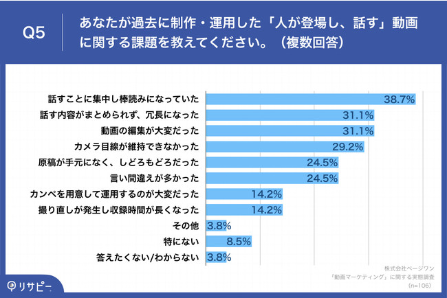 「Q5.あなたが過去に制作・運用した「人が登場し、話す」動画に関する課題を教えてください。(複数回答)」(n=106)と質問したところ、「話すことに集中し棒読みになっていた」が38.7%、「話す内容がまとめられず、冗長になった」が31.1%、「動画の編集が大変だった」が31.1%という回答となりました。
