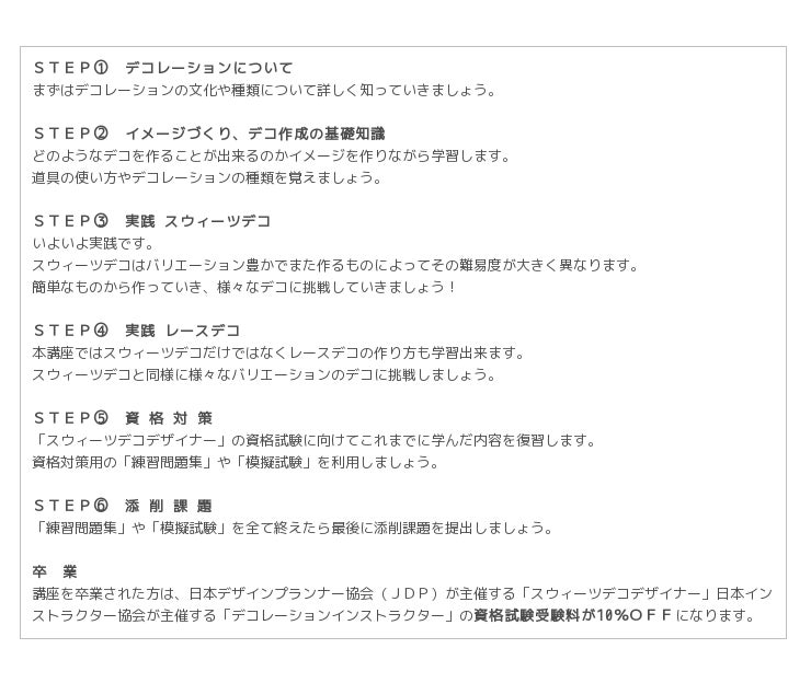 スペシャル講座なら「添削課題」を全てクリアすることで本講座卒業とされ、デコレーションインストラクター(https://www.jpinstructor.org/shikaku/deco/)とスウィーツデコデザイナー(https://www.designshikaku.net/test/sweetsdeco/)の2資格を100%資格取得出来ます。1度の学習でWの資格を取得出来ます。