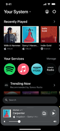 充実したシステム操作:ホーム画面を下から上にスワイプすると、システム全体をシームレスにコントロールでき、各Sonos製品で再生中のコンテンツを視覚的に表示したり、スピーカーを簡単にグループ化したり、またアプリのどこからでも適切な音量調節ができます。