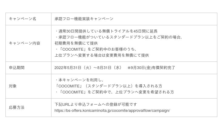 承認フロー機能の利用をご希望されるお客様に向け、2022年5月31日(火)から8月31日(水)までの期間、オンラインマニュアルサービス「COCOMITE」のトライアル版の利用期間を延長するキャンペーンを実施いたします。また、すでに「COCOMITE」をご契約いただいているお客様には、上位プランへのご変更を無償で行っていただけます。