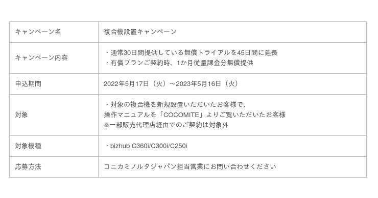 対象のコニカミノルタ製複合機を新規で設置いただいたお客様に、これまで印刷物として配布していた複合機の操作マニュアル(クイックガイド)をオンラインマニュアルサービス「COCOMITE」にてご提供しております。紛失や劣化の恐れのないオンラインマニュアルの利便性を感じていただき、お客様企業におけるマニュアル運用に「COCOMITE」をご検討いただける場合は、トライアル期間の延長などの特典をご提供いたします。