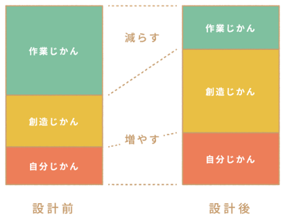 働く人の時間を分解していくと、作業をコツコツこなす「作業じかん」、新しいアイデアを生み出す「創造じかん」、そして休み、育み、学び、視野を広げる「自分じかん」の3つがあると考えています。一般的な働き方改革の考え方は、主にこの「作業じかん」を減らすことに注目することが多いですが、減らすだけでなく、「創造じかん」「自分じかん」といった、「いいじかん」を増やすこと、すなわち、生産性・創造性を高めることが重要だと考えています。