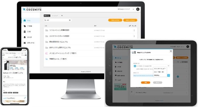 「COCOMITE」は、オンライン上でマニュアルを作成し、運用できるサービスです。画像や動画を用いた見やすく分かりやすいマニュアルが、誰でも簡単に作成できることが大きな特徴です。PCだけではなく、タブレットやモバイル端末からの閲覧も可能なため、社内外問わずどこからでもマニュアルにアクセスすることが可能です。