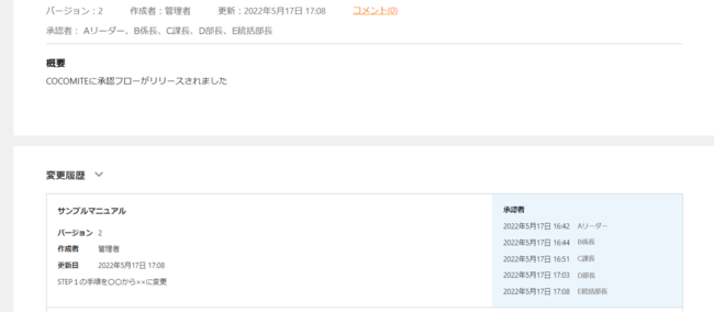 承認後は変更履歴にバージョン・作成者・更新日・更新メモ(任意)に加え、承認者・承認日時も記載されます。