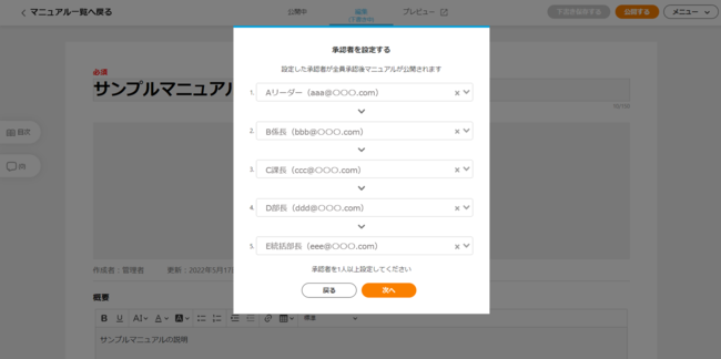 マニュアルの公開時に、承認者を設定し承認フローを実行できます。承認者がマニュアルを確認し、承認をするとマニュアルが公開されます。