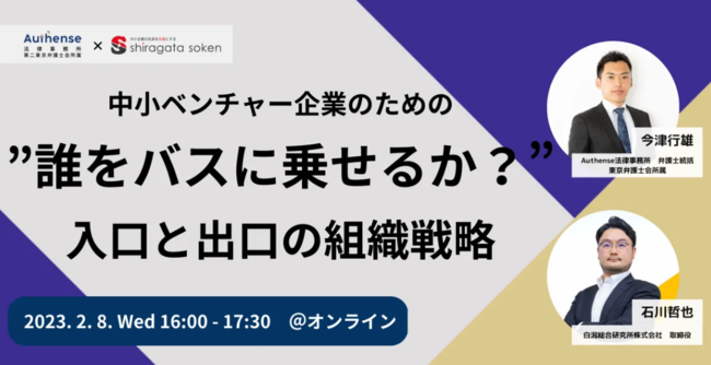 【2月8日(水)16:00〜】Authense法律事務所と白潟総研が、共催ウェビナー「中小ベンチャー企業のための"誰をバスに乗せるか?入口と出口の組織戦略」を実施