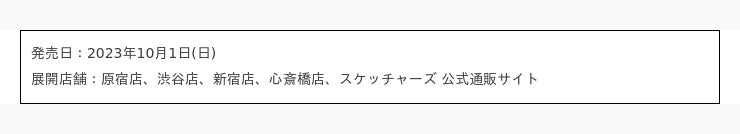 今回発表されるアイテムは第一弾コラボレーションコレクションとなり、2023年10月1日(日)より一部スケッチャーズ ストアおよび、スケッチャーズ 公式通販サイトにて発売開始致します。