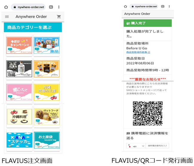 一方、FLAVIUSでネット注文された商品は引き渡しのための必要情報が顧客(注文者)のスマホに返信されます(受取場所、受取可能時間、解錠QRコード等)。顧客は指定された時間に受取場所(空港内Before U Go店舗)のロッカーにおいてQRコードをかざして解錠し商品を受け取ることになります。
