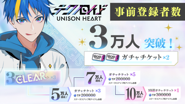 「kokoro」を育むパズルアドベンチャー『テクノロイド ユニゾンハート』(略称:テクユニ)は、App Store・Google Playにて事前登録受付中です。事前登録者の人数に応じて、豪華アイテムをゲーム開始時にプレゼントいたします。この度、事前登録者数3万人を突破いたしました。ぜひこの機会にご登録ください。