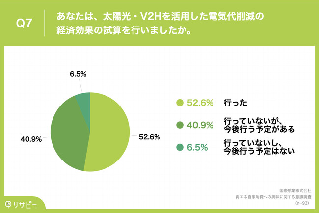 Q4(活用したい「再エネ自家消費」のパターン)で「EVのみ」「わからない/特にない」以外を回答した方に、「Q7.あなたは、太陽光・V2Hを活用した電気代削減の経済効果の試算を行いましたか。」(n=93)と質問したところ、「行った」が52.6%、「行っていないが、今後行う予定がある」が40.9%という回答となりました。